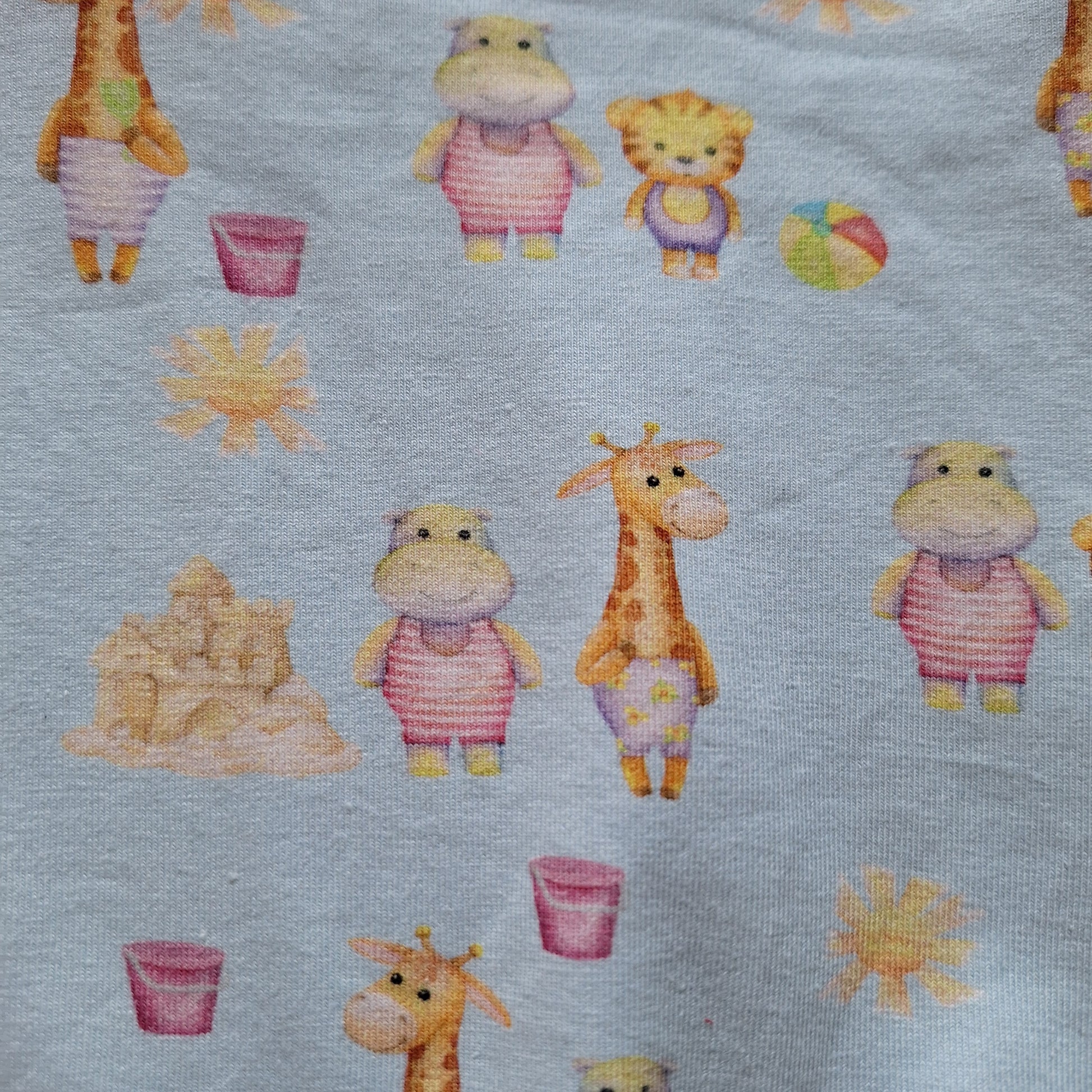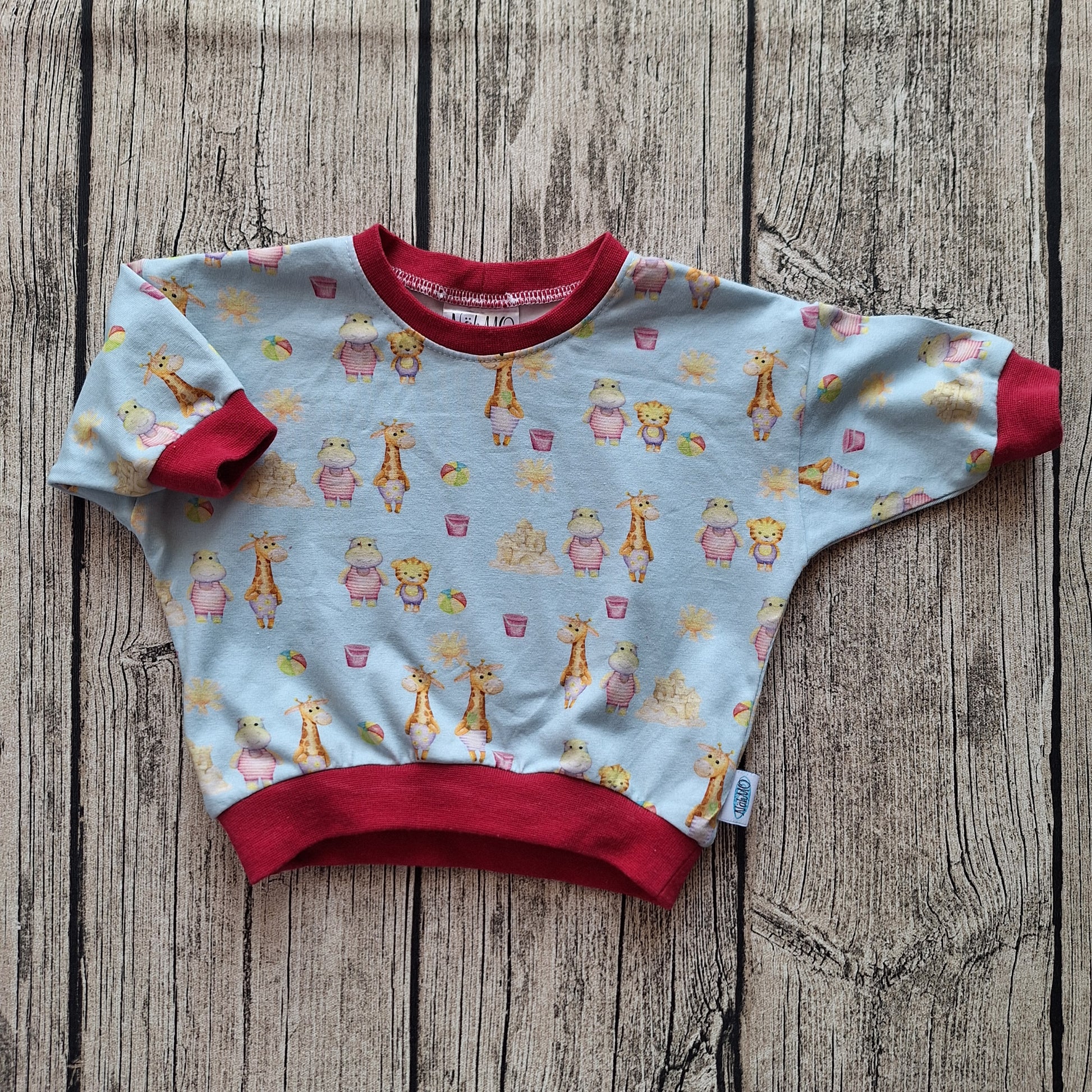 Dieser hellblaue Oversized Sweater in Größe 56 bringt gute Laune ins Baby-Outfit: Eine fröhliche Giraffe und ein gemütliches Nilpferd bauen gemeinsam eine Sandburg – ein liebevoller Print, der sofort ein Lächeln zaubert. ☀️🧡