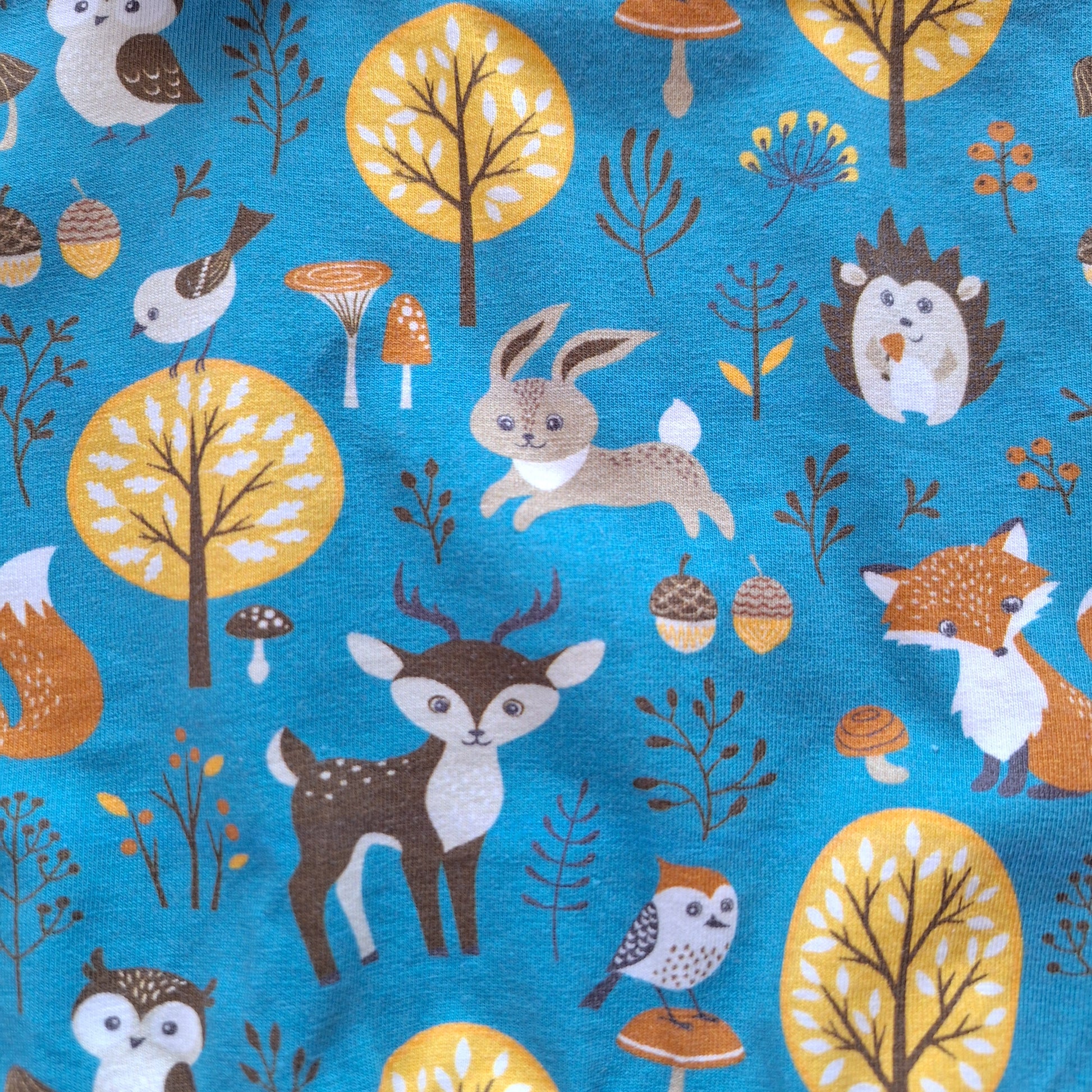 Dieser wunderschöne Oversized Sweater in kräftigem Petrol entführt kleine Naturfreunde in eine liebevoll illustrierte Waldwelt: Igel, Hasen, Eulen, Rehe und Vögel tummeln sich zwischen Bäumen und Sträuchern und machen den Sweater zu einem echten Hingucker. 🦔🦌🐦